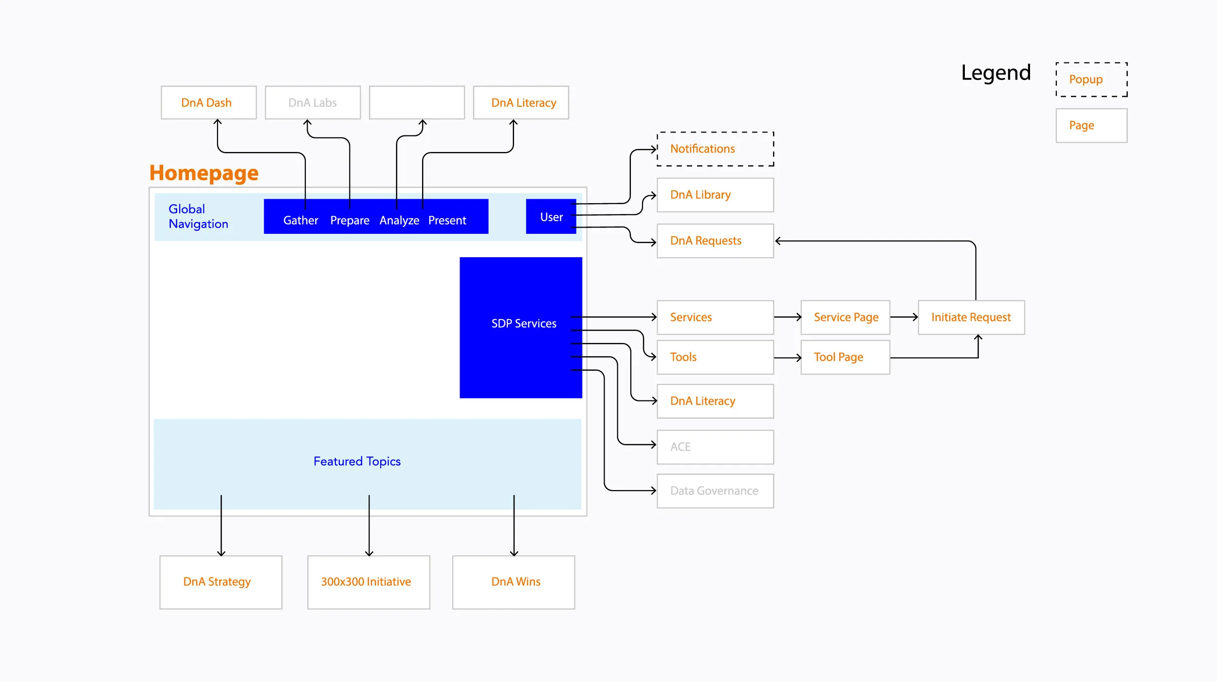 The navigation for Data and Analytics (DnA) is complex because of the different areas that it shelters: data processing (main area) and services under this area, user profile and collections, content creation, and other services and their components.
